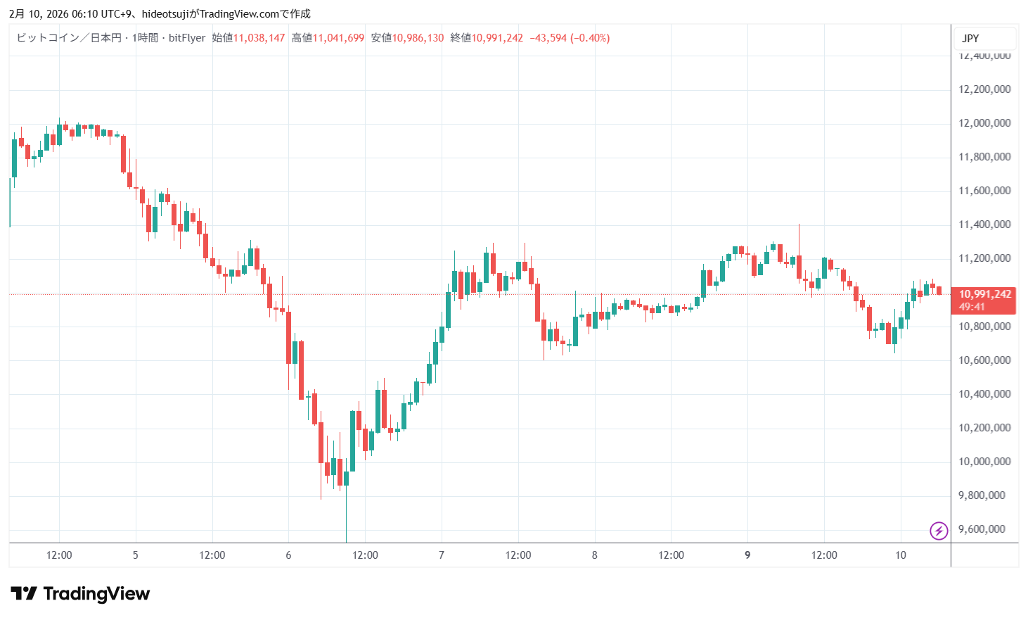 2月9日のビットコインは、終値ベースで、マイナスの値動きとなった。8時台には最高値1140万円台まで上昇したが、その後は伸びを欠いて押し戻され、終値は1079万円台をつけ、取引をひけた。