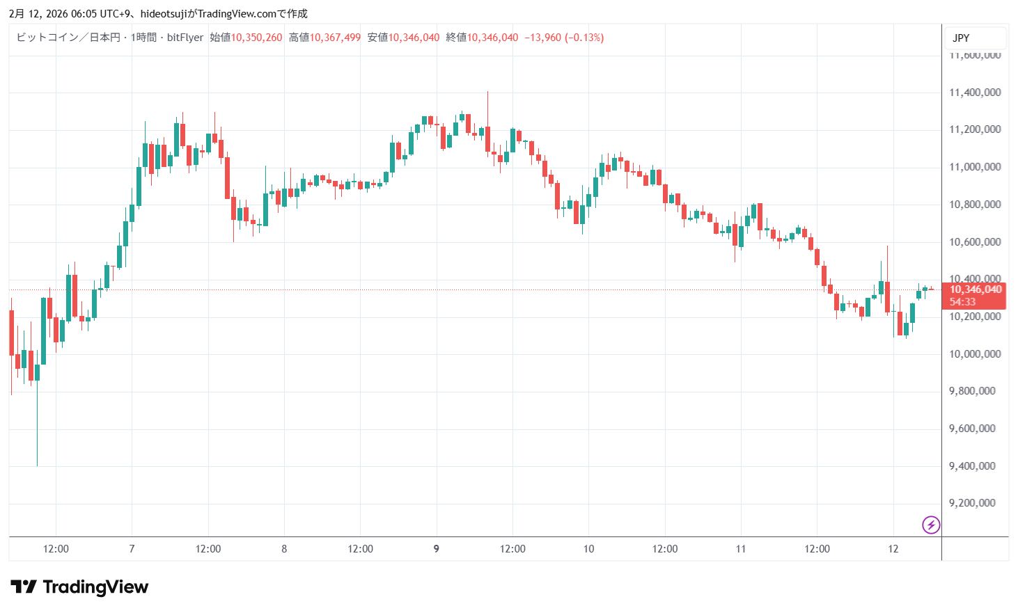。2月12日のビットコインは、始値10,227,854円で寄りついた後、10,088,888円まで下落したが、10,23,409円まで買い戻されて上昇し、1時台には10,318,478円まで上昇したが、10,106,318円まで押し戻されて下落した。