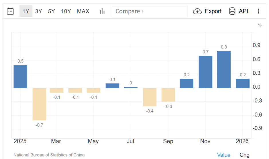 1月の中国の消費者物価上昇率は前年同月比0.2%増