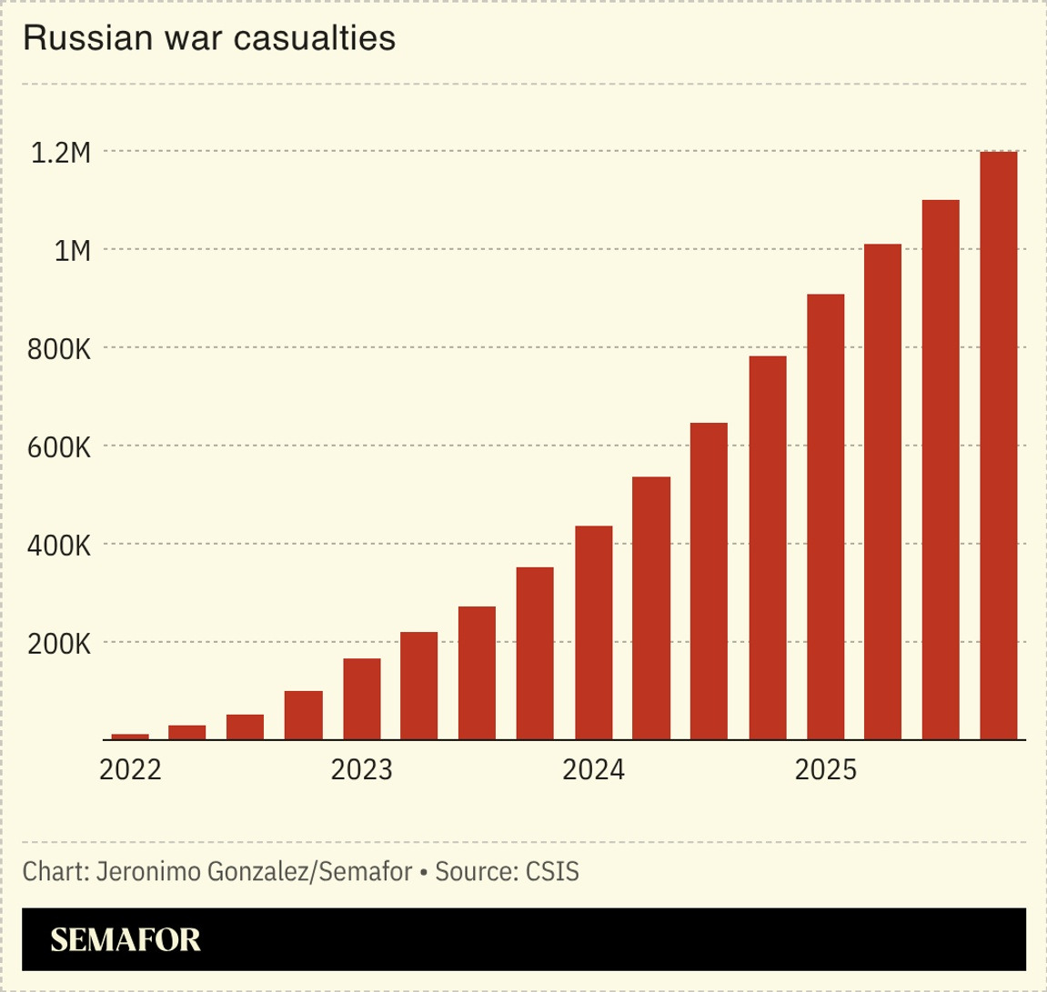 ロシアの戦場での死傷者数は増加しており、差し迫った経済危機の兆候が強まっている。欧州当局者によると、ロシアは巨額の財政支援にもかかわらず、損失を補填するのに十分な兵士を募集できず、そのため進撃も鈍化している。