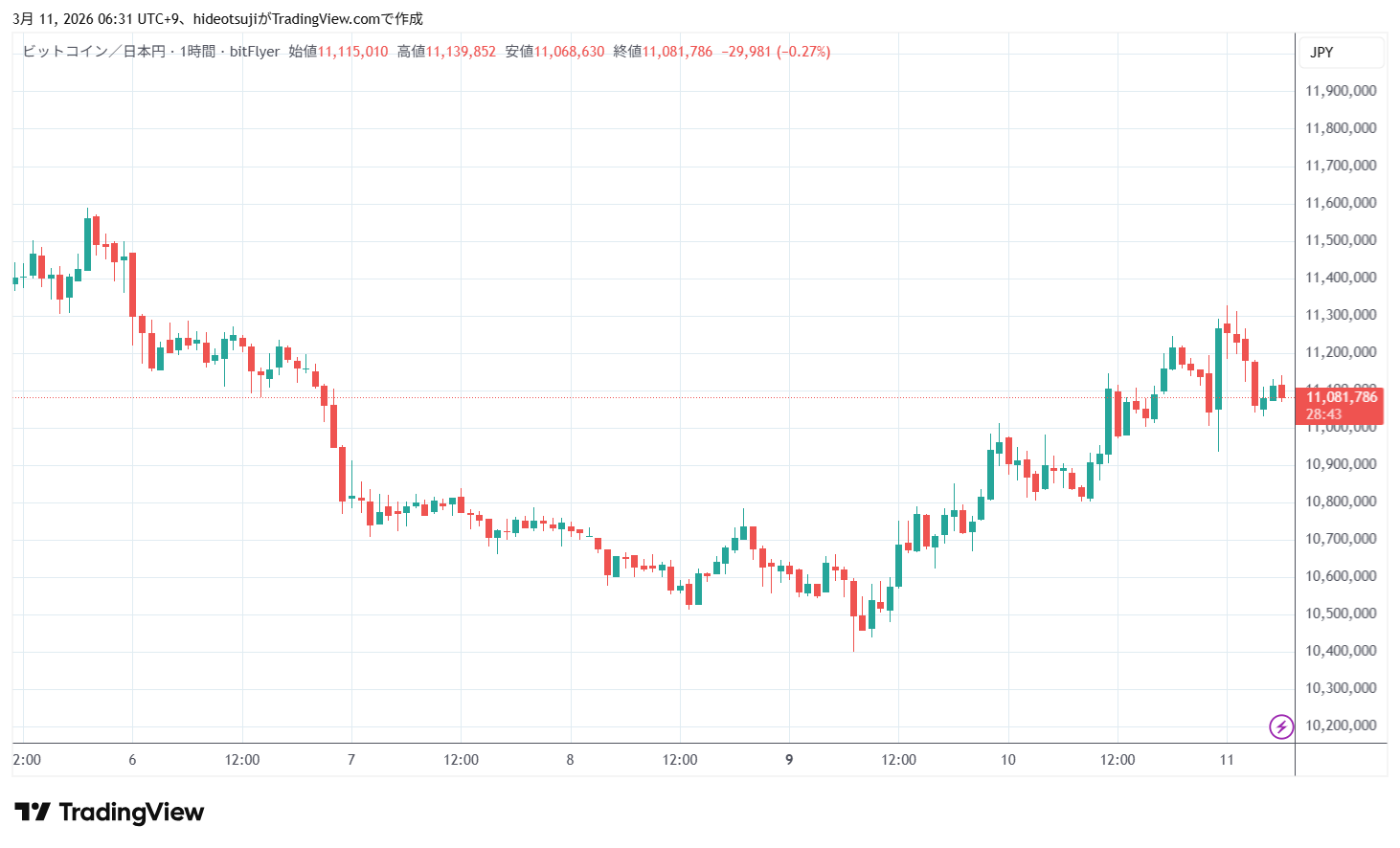 3月11日のビットコインは、始値11,279,172円で寄りついた後、11,325,999円まで上昇したが、11,254,972円まで押し戻されて下落し、3時台には11,041,000円まで下落したが、11,060,424円まで買い戻されて上昇した。
