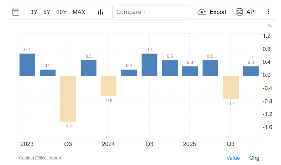 日本の2025年第4四半期のGDPは、前期比0.3%増となり、速報値の0.1%増を上回り、市場予想と一致した。これは、個人消費、企業投資、政府支出の上方修正を受け、第3四半期の0.7%減から反転した。