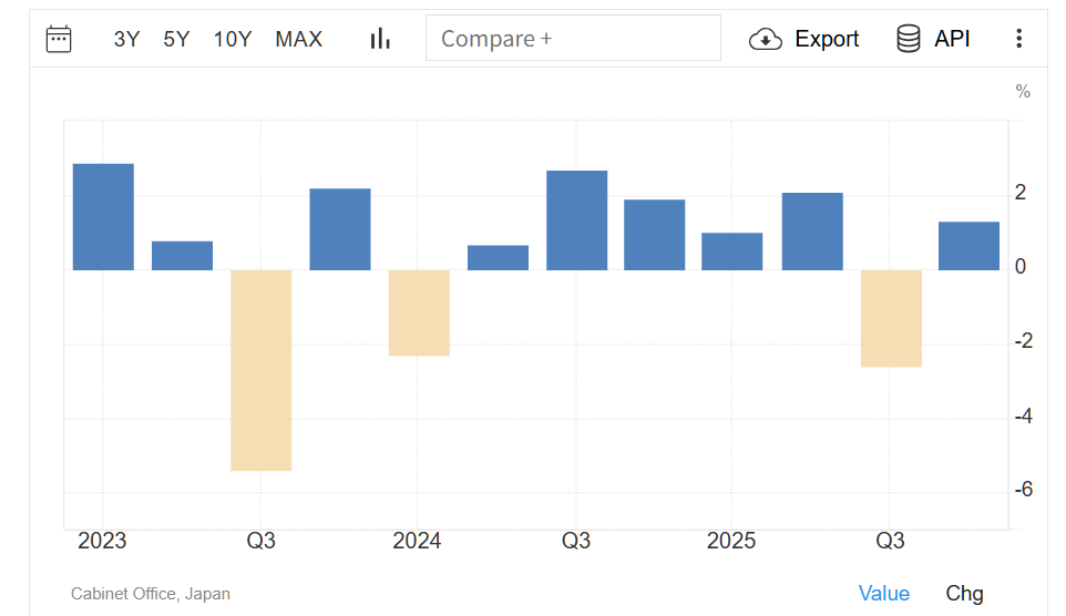 2025年第4四半期の日本経済は、年率1.3%の成長率となり、当初予測の0.2%増を大きく上回り、市場予想の1.2%をわずかに上回った。この修正値は、主に堅調な国内需要に支えられ、第3四半期の2.6%減からの持ち直しとなった。