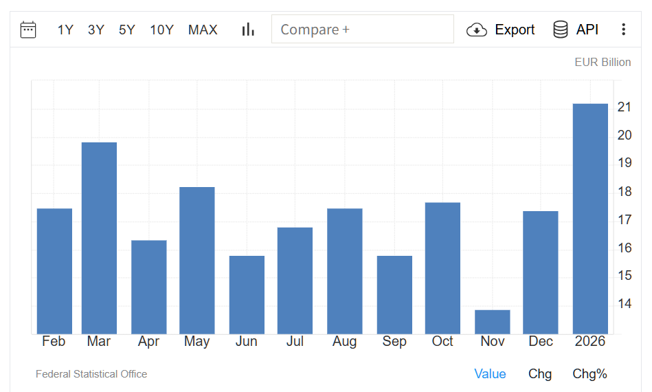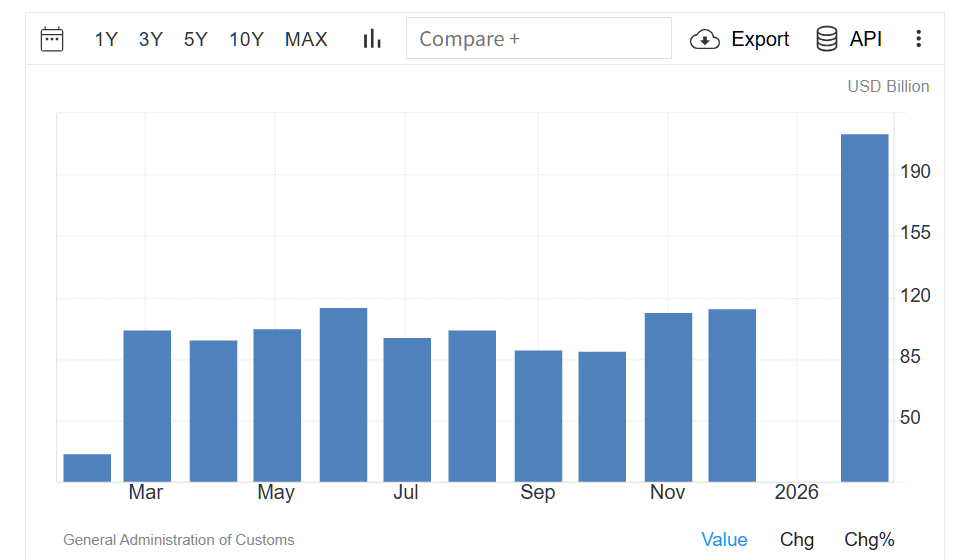 中国の2026年最初の2カ月間の貿易黒字は、2,136.2億米ドルで、市場予想の1,966億米ドルを上回り、2025年には過去最高の黒字となる1兆1,890億米ドルを記録した。