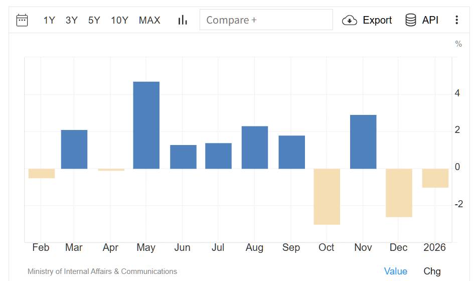 2026年1月の日本の家計支出は、前年同月比1.0%減となり、前月の2.6%減から縮小したものの、市場予想の2.5%増を裏切った。
