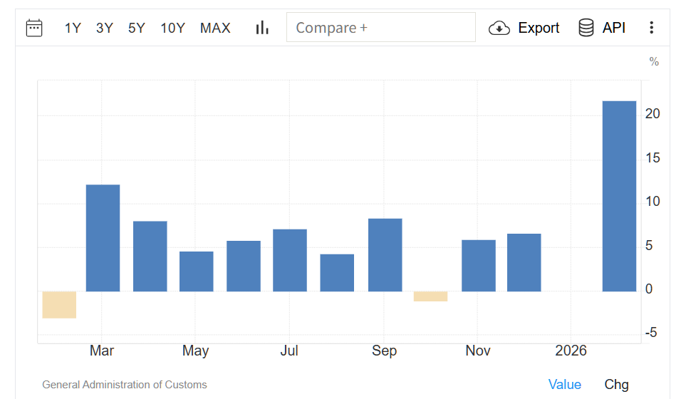 輸出は前年比21.8%増の6,565.8億米ドルと、12月の6.6%増から大幅に加速し、予想の7.1%増を大きく上回った。この急上昇は、堅調な世界需要と年初からの好調なスタートに後押しされ、2021年10月以来の出荷高の急成長を記録した。