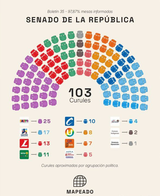 予測によると、現職のグスタボ・ペトロ大統領が率いるPHは、上院103議席のうち23~25議席を獲得する見込みで、前回期の20議席から増加。2022年選挙より100万票以上多い得票数を記録した。