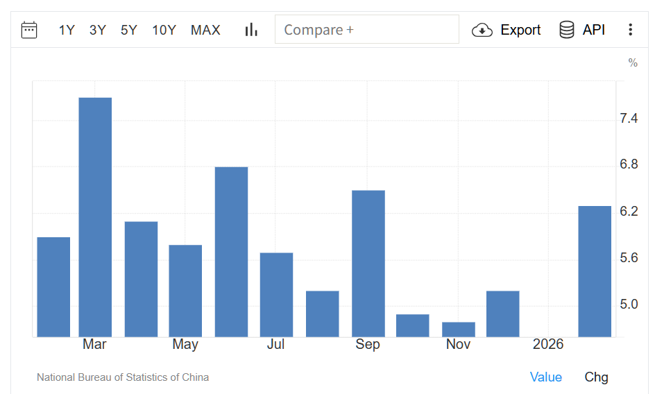 中国の2026年1月から2月までの期間の鉱工業生産性は、前年同期比6.3%増加し、12月の同5.2%増から加速し、市場予想の同5.1%を上回った。