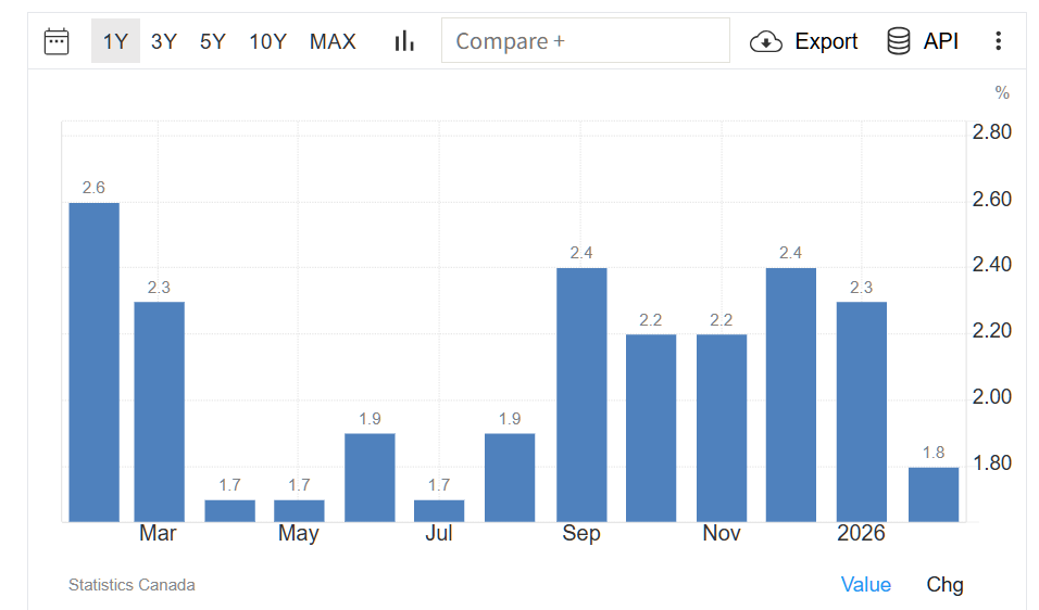 カナダの総合インフレ率は、2026年2月に前月の前年同月比2.3%増から同1.8%増に低下し、市場予想の同1.9%増をわずかに下回った。これは前年7月以来の低水準となる。
