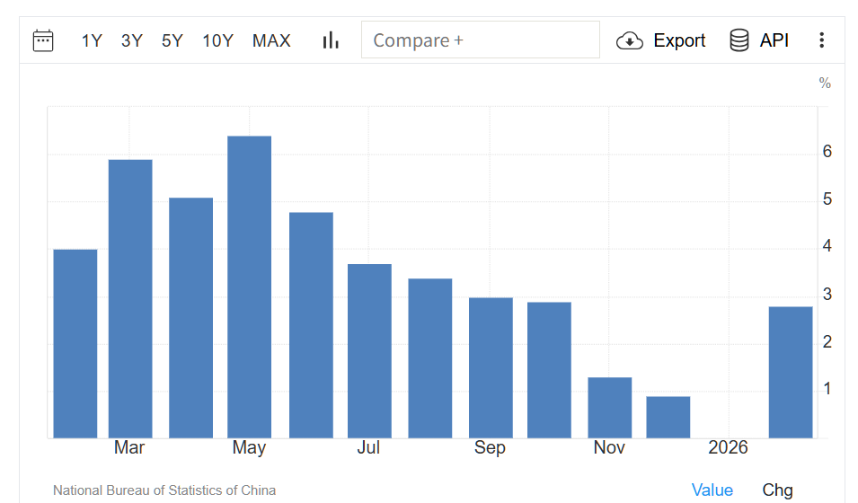 中国は、毎年旧正月の時期が異なるため、1月と2月の小売売上高データを統合して発表しており、より一貫性のある正確な比較を可能にしている。
