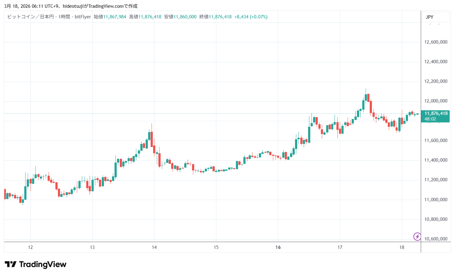 3月18日のビットコインは、始値11,832,205円で寄りついた後、11,914,050円まで上昇したが、11,731,781円まで下落した。その後、11,770,273円まで買い戻されて上昇し、4時台には11,909,695円まで上昇したが、11,869,979円まで押し戻されて下落した。