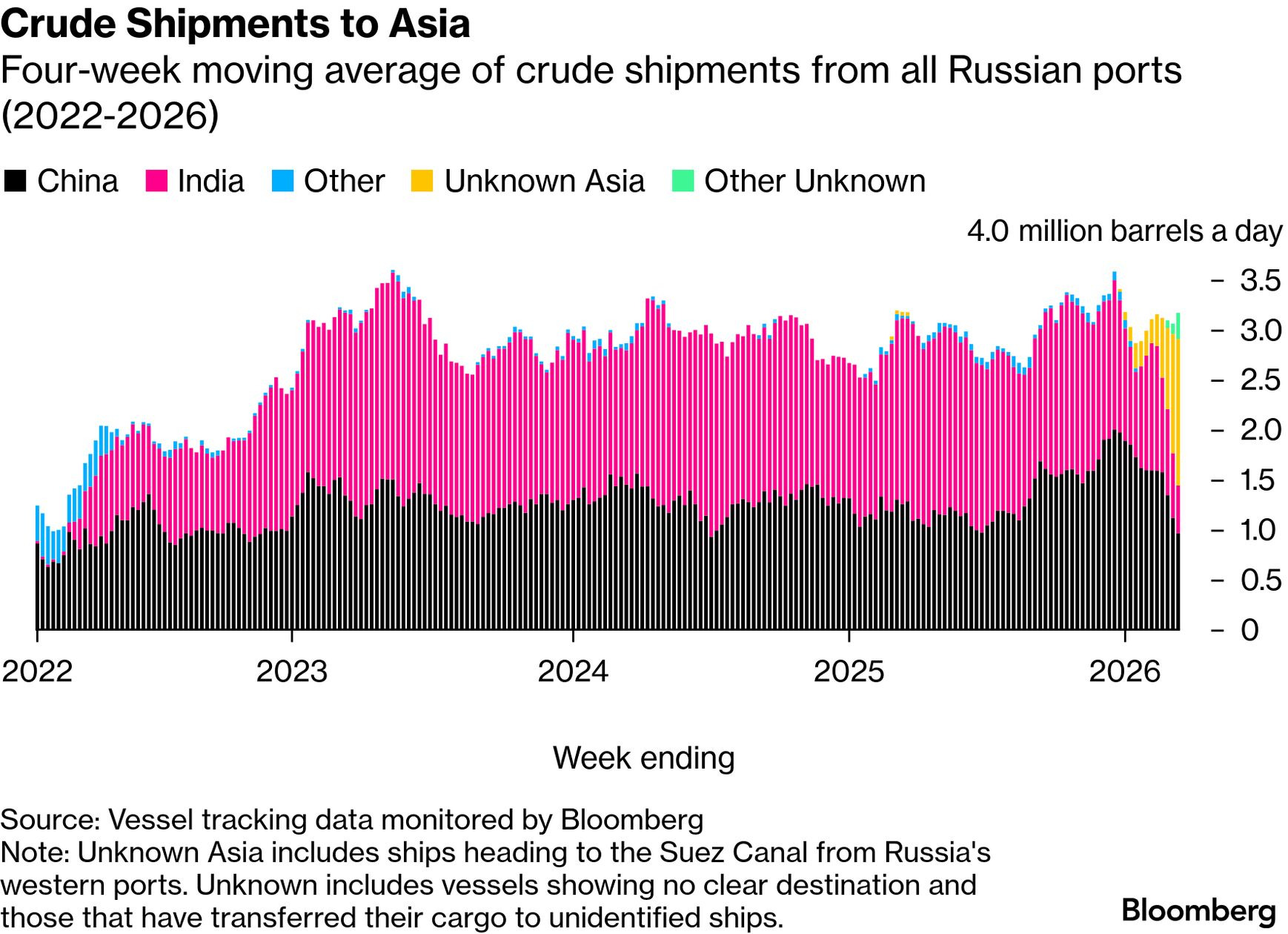 ガソリン価格の高騰で圧力が高まっているトランプ政権による関税免除措置により、買い手はクレムリンによる12年にわたるウクライナ侵攻に関連する制裁を恐れることなく、これらの原油を購入できるようになった。