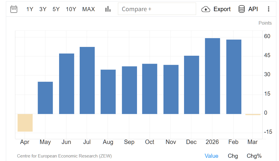 ドイツのZEW景況感指数は、2026年3月に58.8ポイント急落し-0.5となった。これは2月の58.3から低下し、市場予想の39を大きく下回るもので、中東紛争の激化が景況感に深刻な影響を与えた。