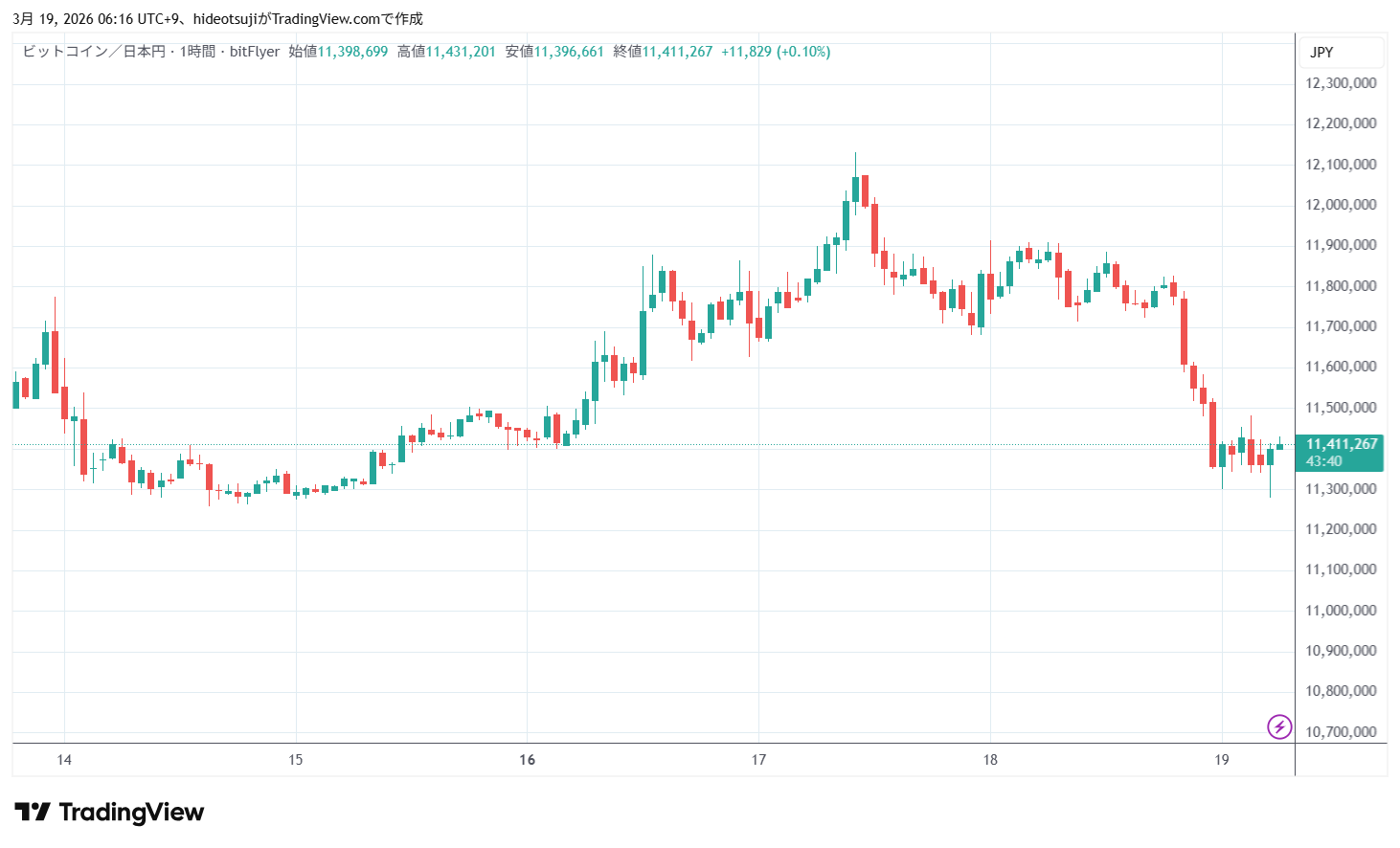3月19日のビットコインは、始値11,357,874円で寄りついた後、11,300,000円まで下落したが、11,412,247円まで買い戻されて上昇し、1時台には22,421,485円まで上昇したが、11,343,588円まで下落した。その後、11,388,277円まで買い戻されて上昇した。