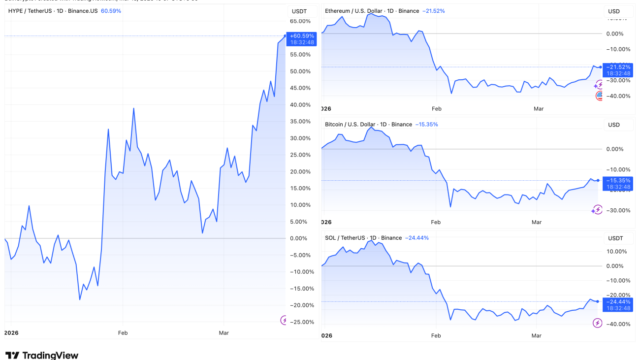 この差は一つの要因に集約されます。HYPEは2026年に60%以上上昇する一方、主要な仮想通貨のほとんどは下落しているのである。この要因はHyperliquidのHIP-3アップグレードにある。