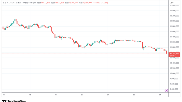 20時台には最安値10,860,238円まで下落したが、10,867,495円まで買い戻されて上昇し、22時台には10,988,700円まで上昇したが、10,950,149円まで押し戻された。