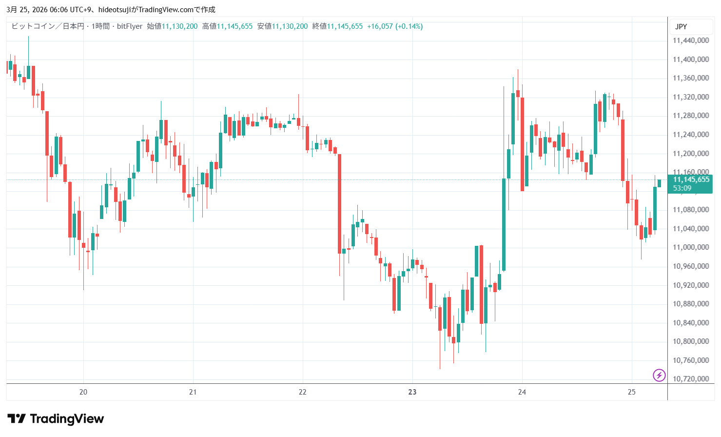3月25日のビットコインは、始値11,103,845円で寄りついた後、11,155,723円まで上昇したが、11,078,775円まで下落した。その後、11,103,642円まで買い戻されて上昇し、1時台には11,123,530円まで上昇したが、11,048,684円まで押し戻されて下落した。