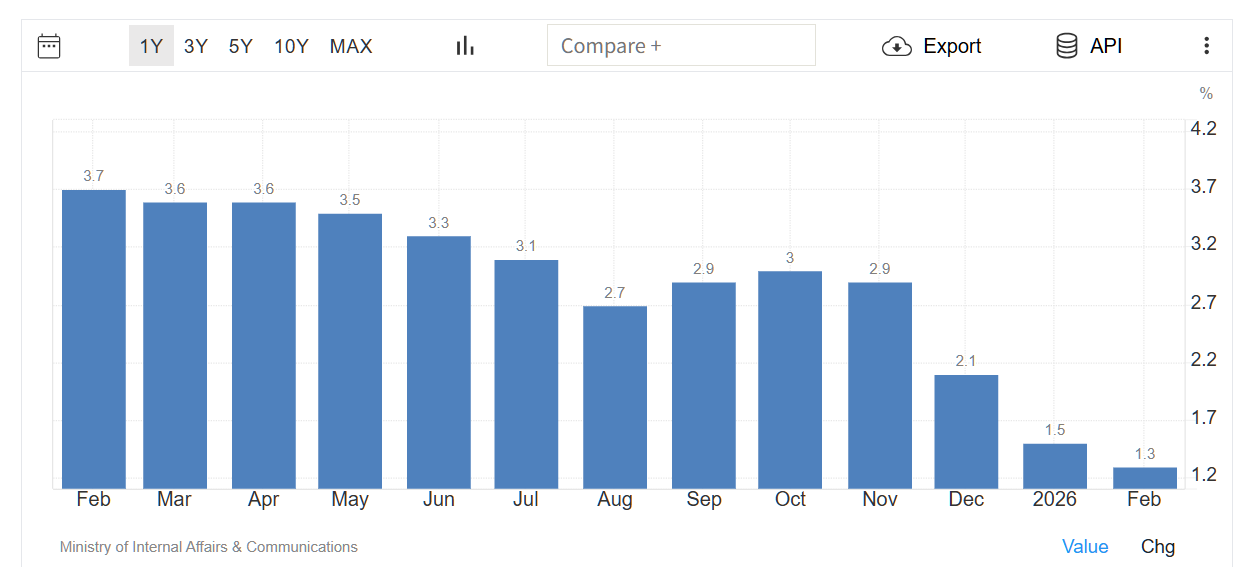 生鮮食品を除くエネルギーを含む日本のコア消費者物価指数は、2026年2月に前年同月比1.6%上昇し、3カ月連続で鈍化し、予想の同1.7%増を下回った。これはまた、2022年3月以来最小の上昇率となった。