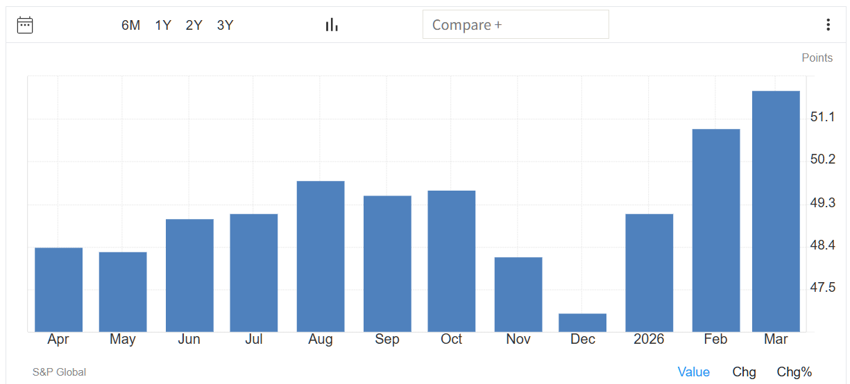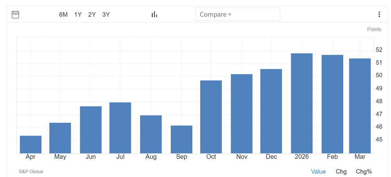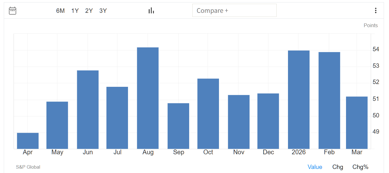 速報値によると、日本の2026年3月のS&Pグローバル製造業PMIは、51.4となり、約4年ぶりの高水準だった前月の53.0から低下し、市場予想の52.8を下回った。