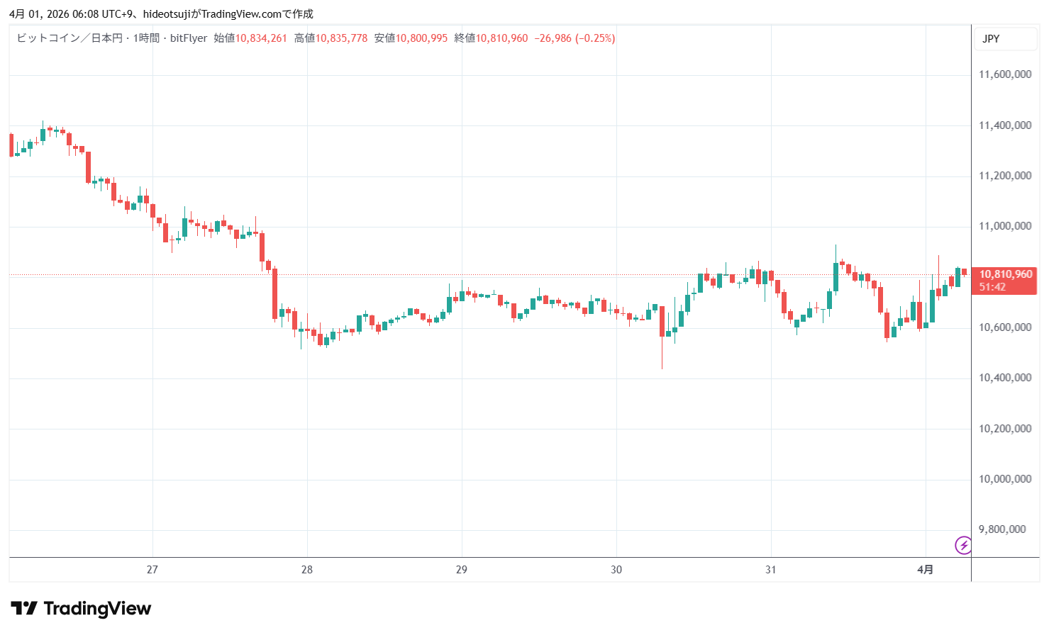 4月1日のビットコインは、始値10,601,001円で寄りついた後上昇し、2時台には10,888,000円まで上昇したが、10,707,269円まで下落した。その後、10,726,695円まで買い戻されて上昇した。