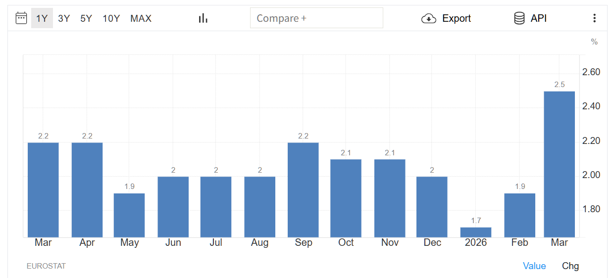 イラン戦争はインフレ懸念を強め、特に欧州がリスクにさらされている。ユーロ圏のインフレ率は3月に2.5%に達し、2025年1月以来の高水準となった。ドイツのインフレ率も今月加速し、1年以上ぶりの高水準となった。