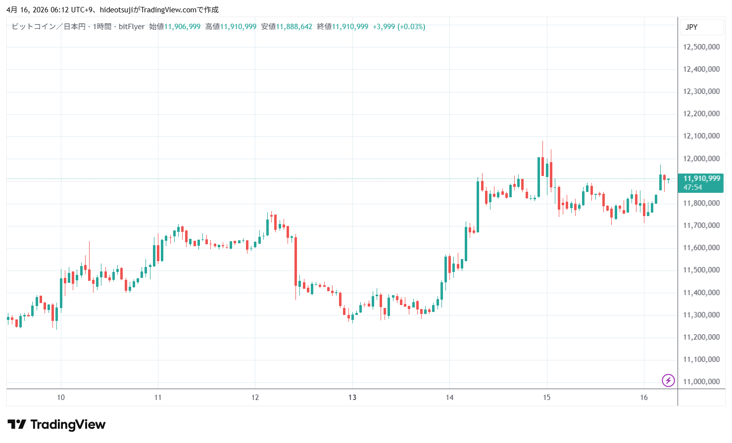4月16日のビットコインは、始値11,800,589円で寄りついた後11,822,138円まで上昇したが、11,712,000円まで下落した。その後、11,746,790円まで買い戻されて上昇し、4時台には11,974,013円まで上昇したが、11,928,962円まで押し戻されて下落した。