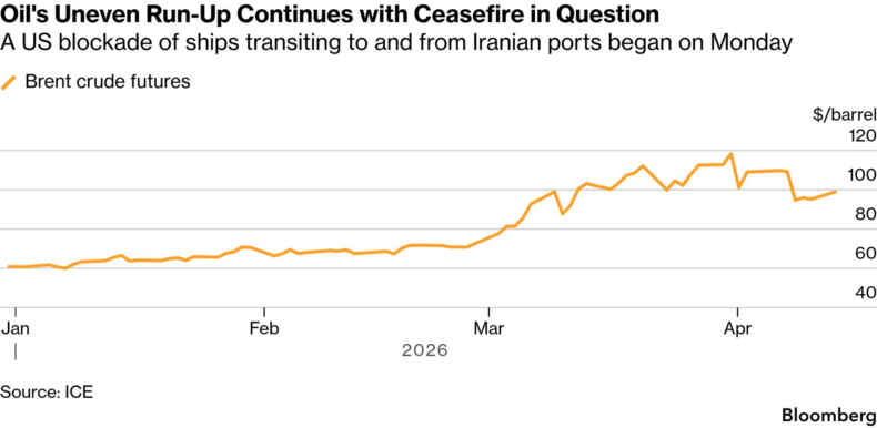 月曜日の原油価格は上昇し、ブレント原油とWTI原油は1バレル100ドルをわずかに下回った。ホワイトハウスからの混乱したメッセージ、具体的に何が封鎖されるのか、イランが「海賊行為」と称する行為に対して脅迫通りの報復措置を取るのか、そして第2ラウンドの協議の可能性など、多くの疑問が残る。