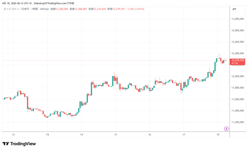 4月17日のビットコインは、終値ベースで、プラスの値動きとなった。2時台には最安値1178万円台まで下落したが、その後は上昇に転じ、23時台には最高値1232万円台まで上昇した。
