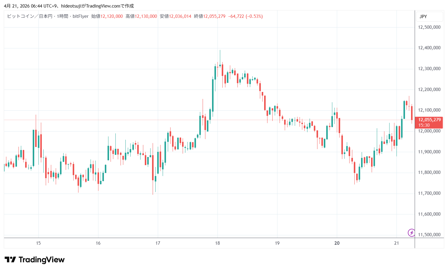 4月21日のビットコインは、始値11,930,641円で寄りついた後、11,878,000円まで下落したが、12,023,709円まで買い戻されて上昇し、4時台には12,150,000円まで上昇したが、12,126,665円まで押し戻されて下落した。