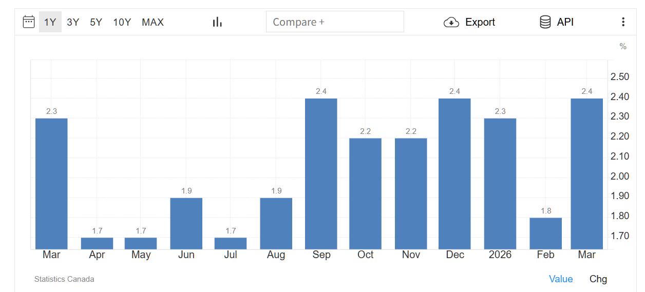 カナダの2026年3月の総合インフレ率は前月の前年同月比1.8%増から同2.4%増に上昇し、1年ぶりの高水準を目指したが、市場予想の同2.5%増をわずかに下回った。