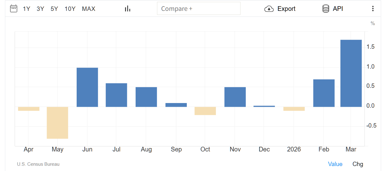 米国の小売売上高は、2026年3月に前月比1.7%と大幅に増加し、市場予想の同1.4%増を上回り、2月の同0.7%増(上方修正)に続くものとなった。