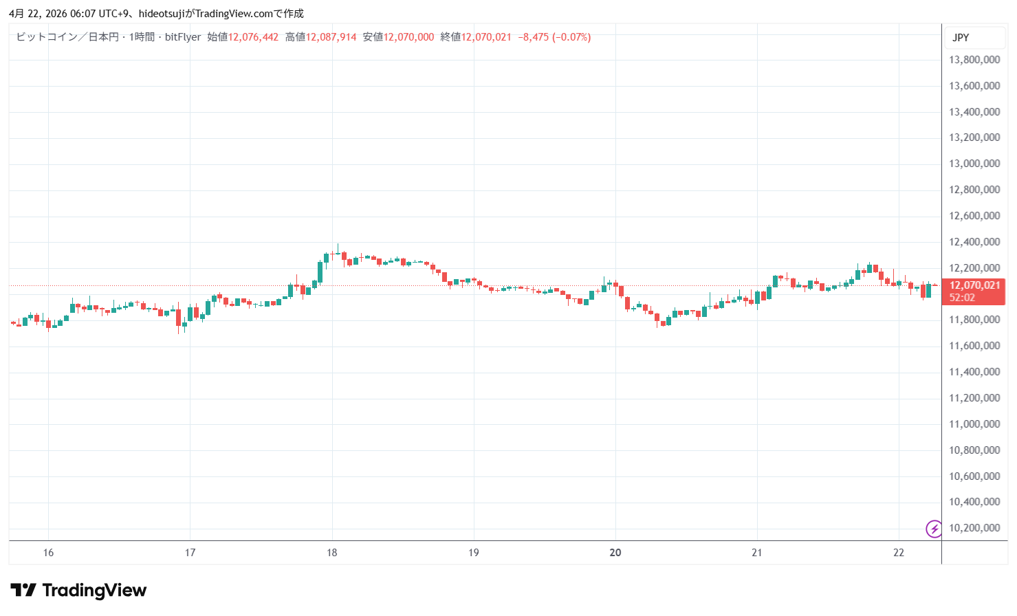 4月22日のビットコインは、始値12,076,739円で寄りついた後、12,035,200円まで下落したが、12,098,700円まで買い戻されて上昇し、1時台には12,150,425円まで上昇したが、12,094,373円まで押し戻されて下落した。
