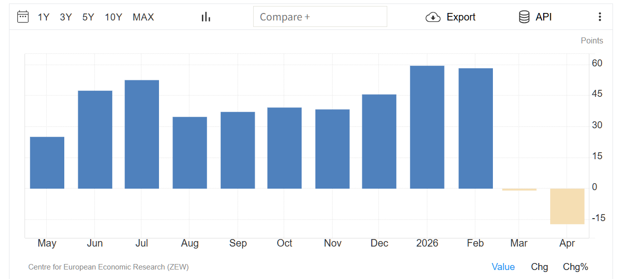 ドイツのZEW景況感指数は2026年4月に16.7ポイント低下し、-17.2となった。これは2022年12月以来の最低水準であり、市場予想の-5.0を大きく下回った。