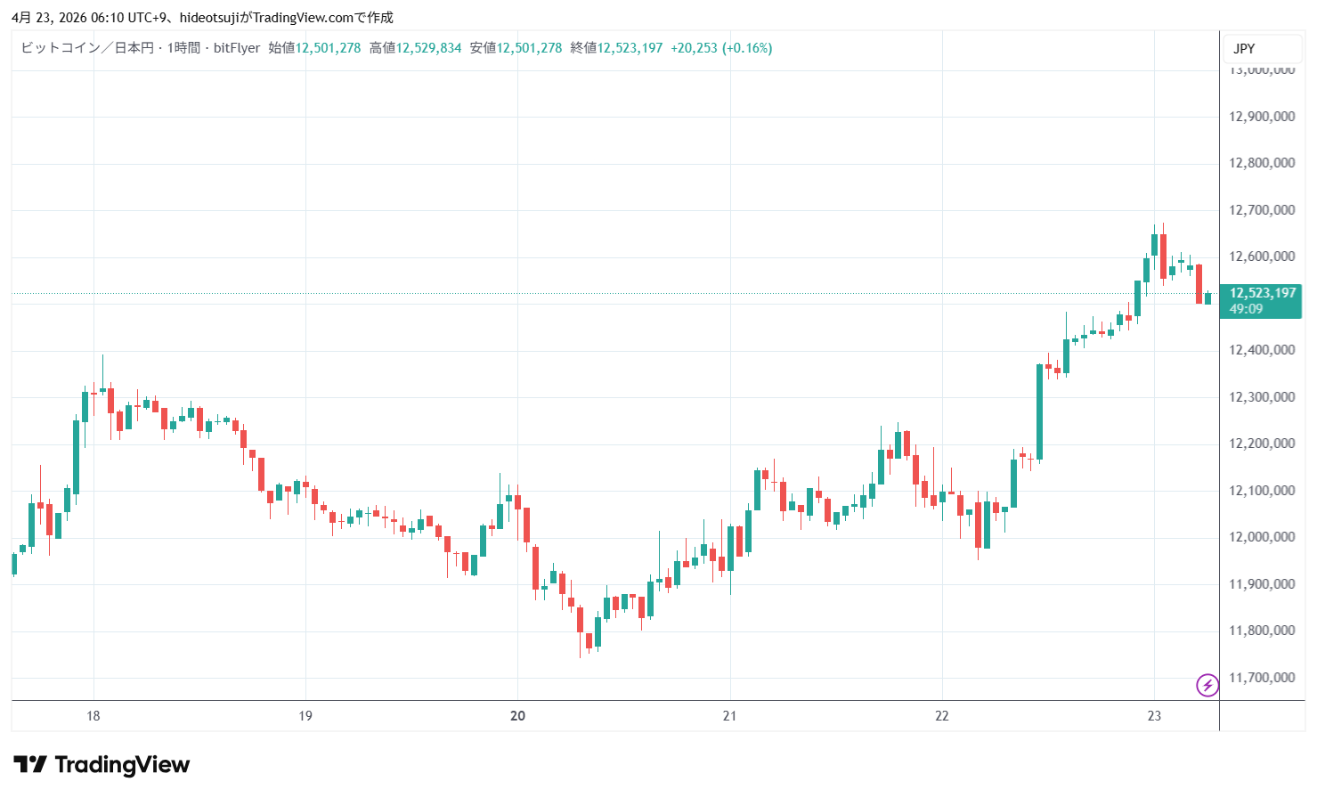4月23日のビットコインは、始値12,605,483円で寄りついた後上昇し、1時台には12,674,674円まで上昇したが、12,539,086円まで下落した。その後、12,556,843円まで買い脅されて上昇した。