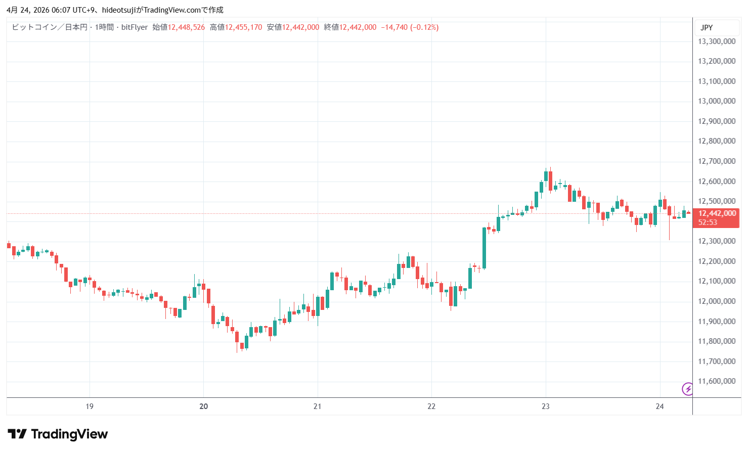 4月24日のビットコインは、始値12,384,723円で寄りついた後、12,373,490円まで下落したが、12,546,177円まで上昇した。その後、12,478,162円まで押し戻された。1時台には12,529,931円まで上昇したが、12,464,403円まで押し戻されて下落した。