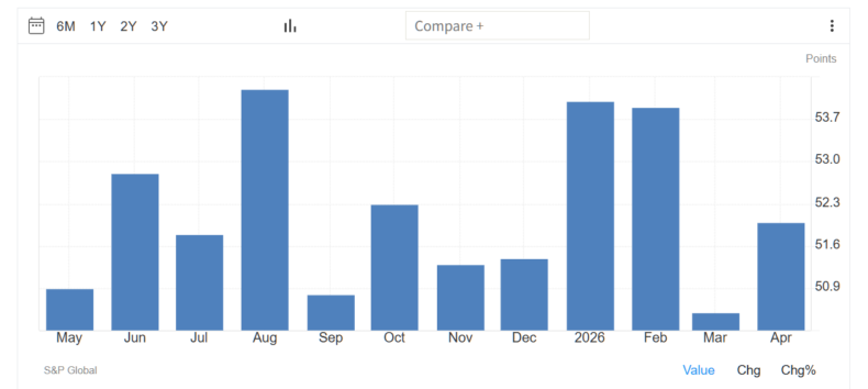 速報値によると、2026年4月のS&Pグローバル英国サービス部門PMIは前月の50.5から52.0に上昇し、市場予想の50を上回った。