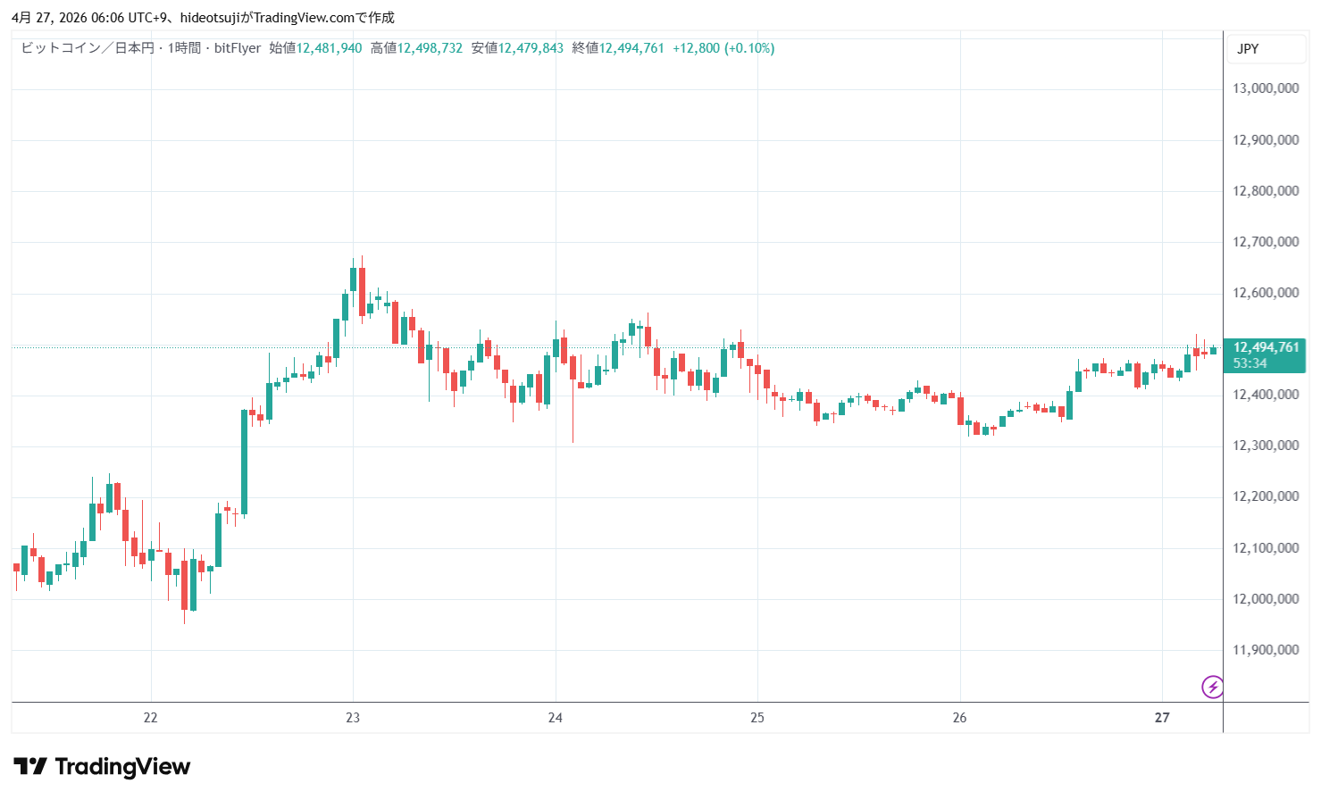4月27日のビットコインは、始値12,461,227円で寄りついた後、12,467,701円まで上昇したが、12,454,771円まで押し戻されて下落し、2時台には12,452,583円まで下落したが、12,449,519円まで買い戻されて上昇した。